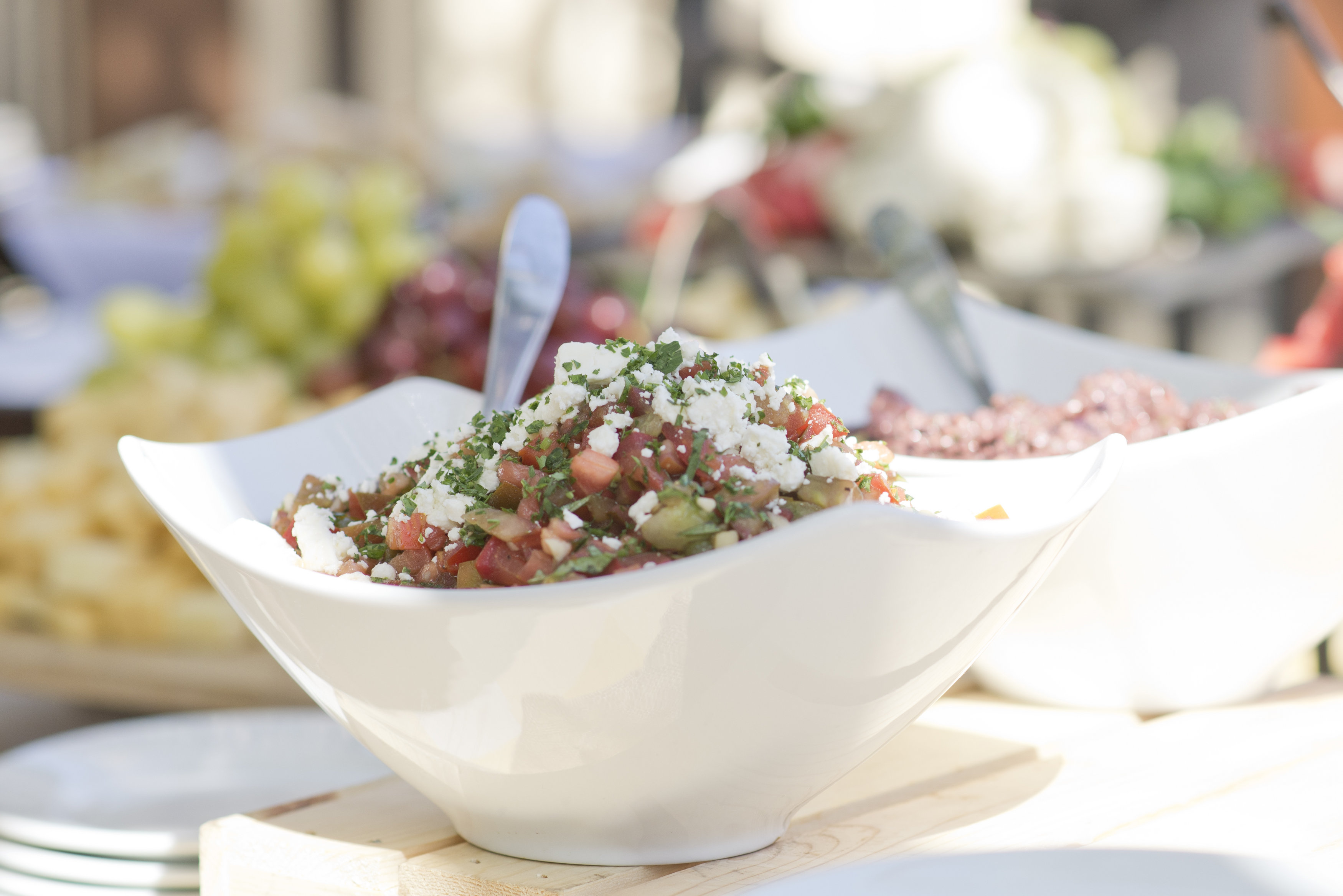 After the backyard ceremony, guests started with our bruschetta bar: three seasonal bruschettas served with toasted sliced baguettes, grilled crostinis & fresh vegetables. Guests also enjoyed heirloom tomato gazpacho shooters with grilled cheese bites and bacon-wrapped dates stuffed with goat cheese.